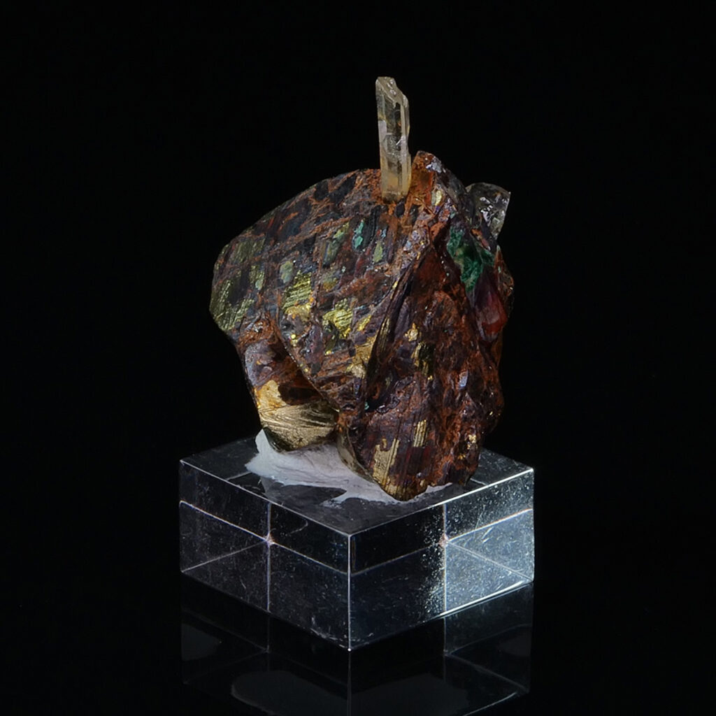 Beautiful specimen combining Chalcopyrite gilded bronze with two crystal clear Quartz