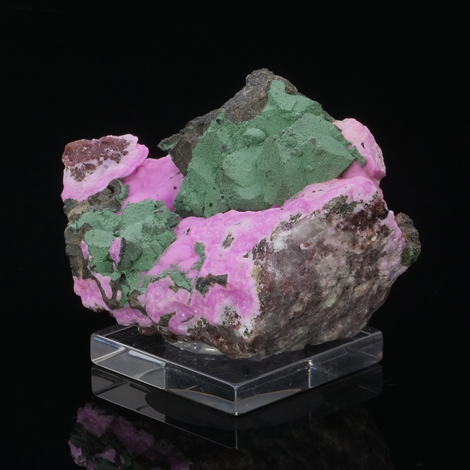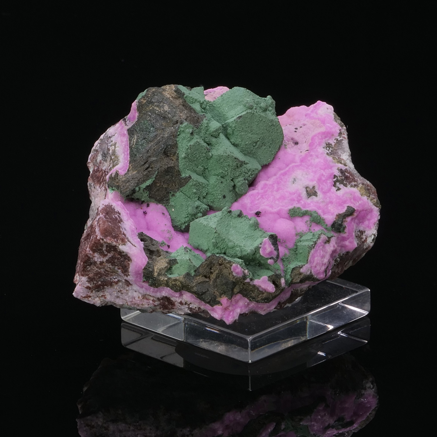 Shiny pink cobaltoan Calcite that has undergone a pseudomorphosis in Malachite on part of the piece. Beautiful sample from the Mashamba West mine in DR Congo.