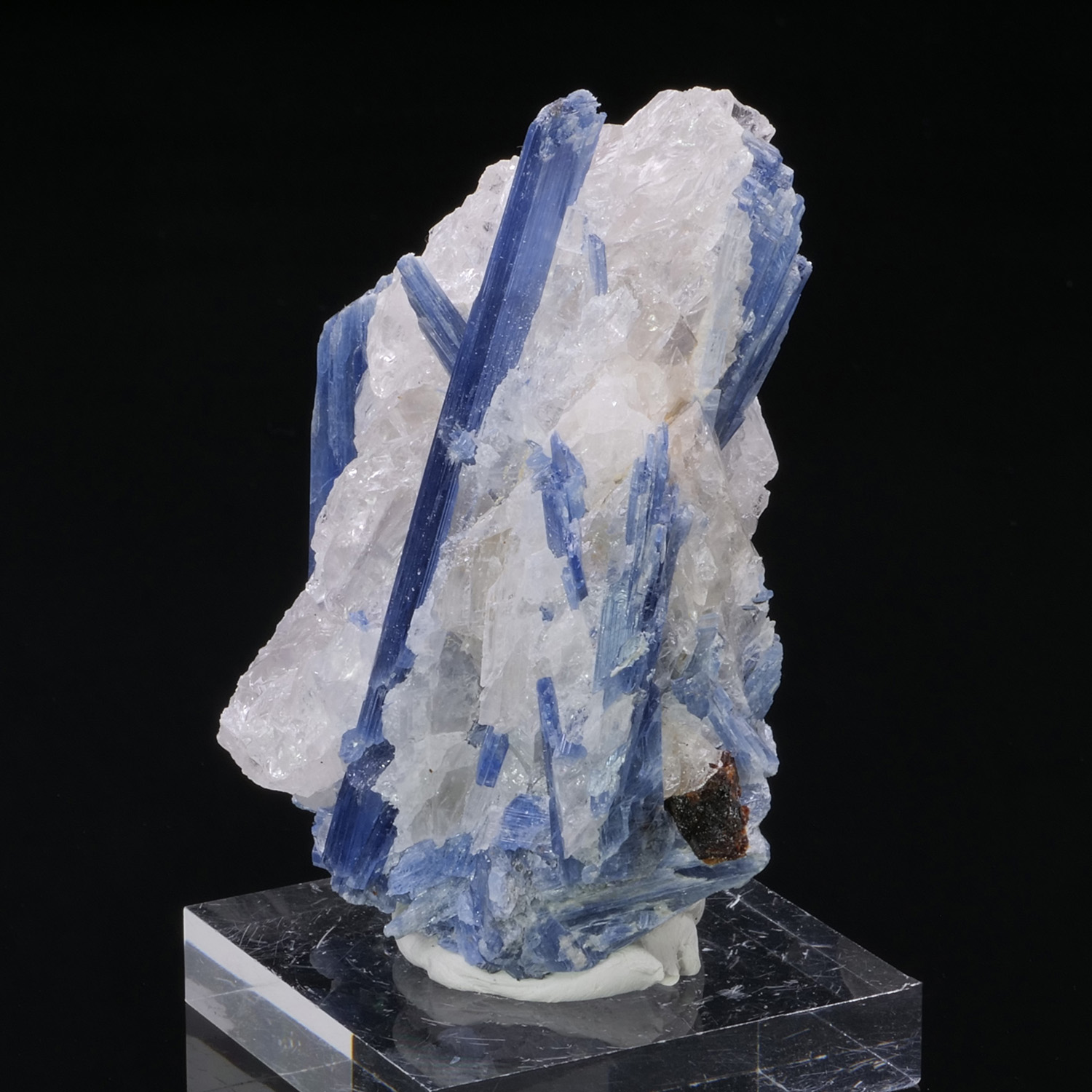 Numerous crystals of Kyanite very well formed and presenting an intense and electric blue color, on and in Quartz matrix which brings even more brilliance and luminosity to the specimen. Piece from Sao Jose da Safira in Brazil.