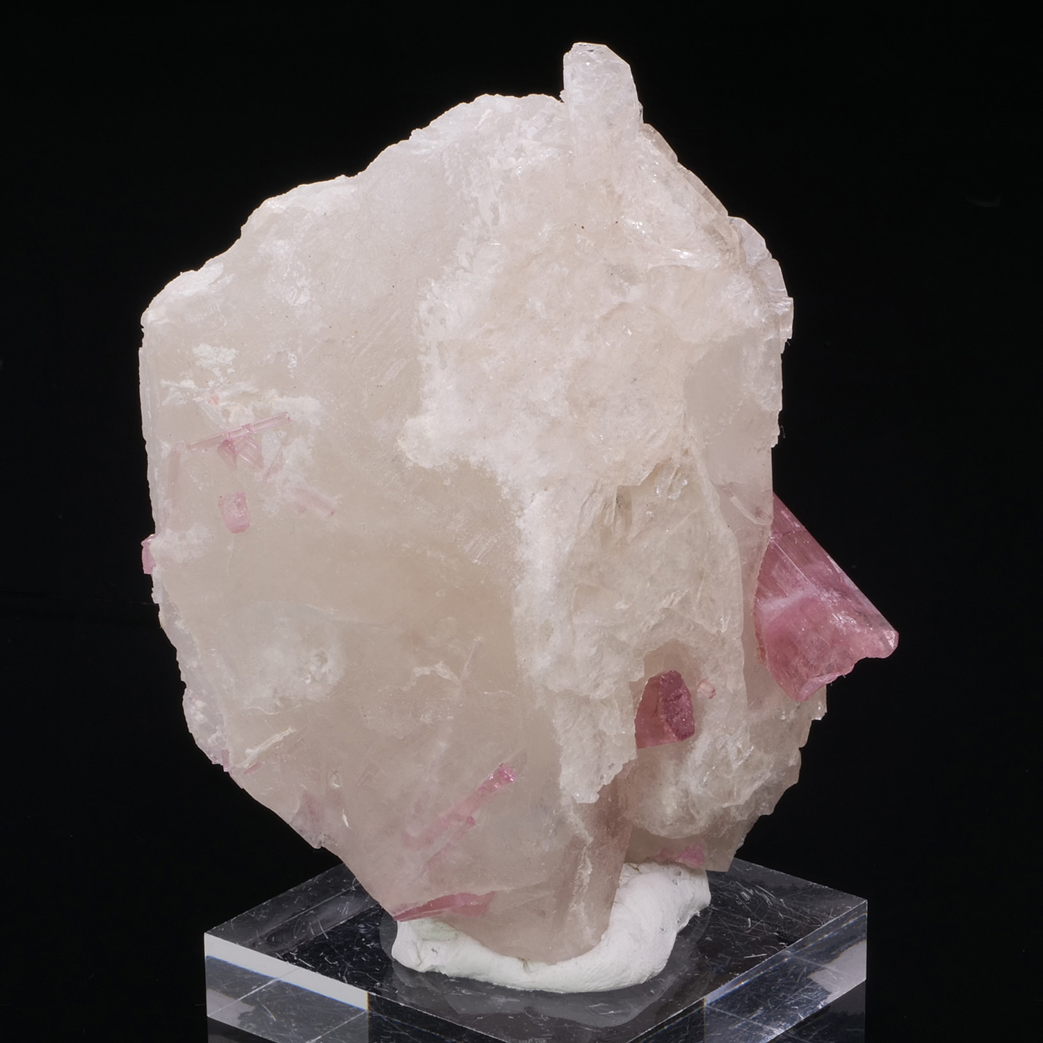 Pink Tourmaline crystals, including one well-formed and presenting a great color, on Quartz from Minas Gerais in Brazil.