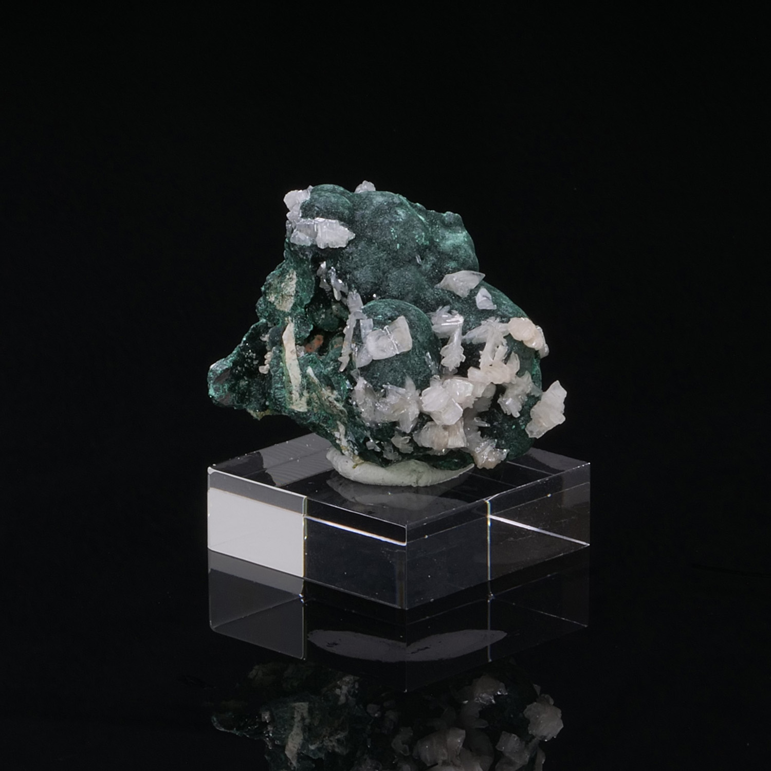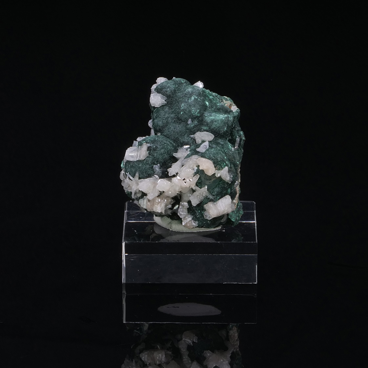 Cerussite specimen on Malachite from the Nakhlak mine in Iran. These pieces feature white Cerussite crystals like snowflakes on dark green brotryoid malachite resembling velvet.