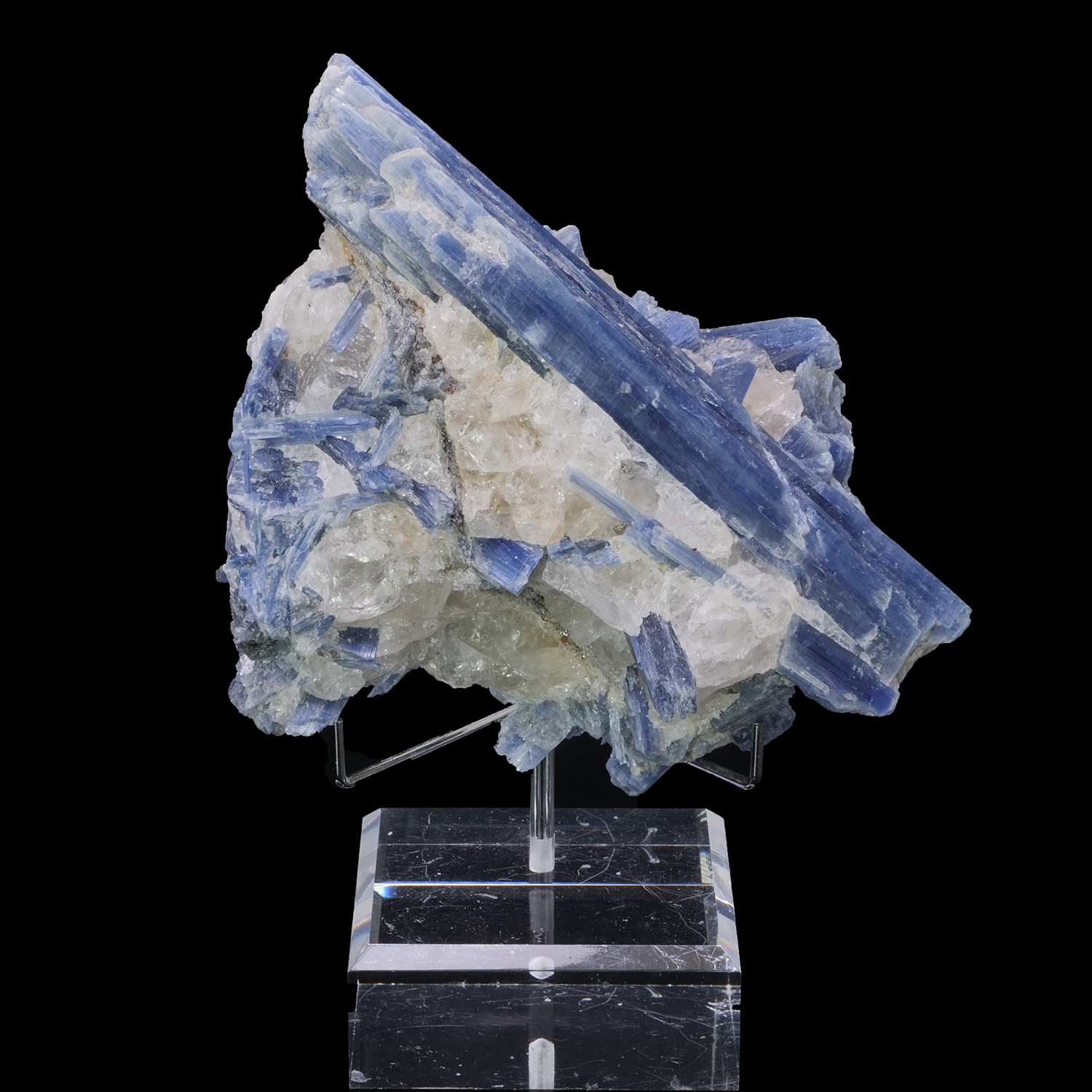 Numerous crystals of Kyanite very well formed and presenting an intense and electric blue color, on and in Quartz matrix which brings even more brilliance and luminosity to the specimen. Piece from Sao Jose da Safira in Brazil.